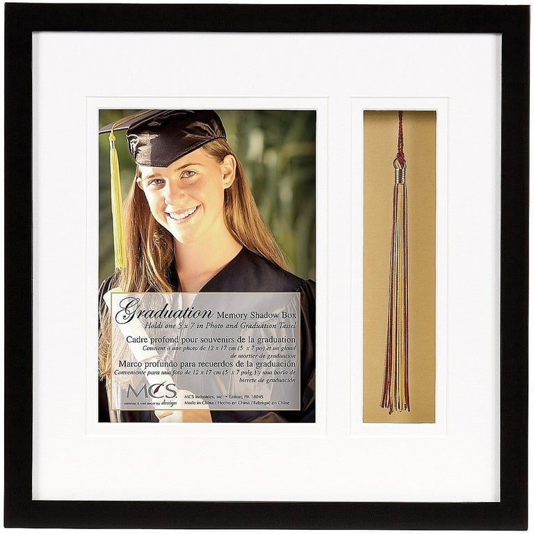 Back to results Scroll Items 122 of 11385 Main view Product Details MCS® GRADUATION MEMORIES 5x7 Frame and Tassel Holder — For the graduate and family, the GRADUATION MEMORIES frame will be a treasured remembrance of the special day.Ebony black square-corner frame construction in extremely realistic mdf wood. Glare resistant glass lens.Space in the professionally cut off-white double mat for your 5"x7" photo and 1½"w x 6½"h tassel.Personalizing, on the mat, is offered in our CART. Add the item to a CART on SendAFrame.com click Personalize This Item. By MCS®. GRADUATION MEMORIES 5x7 Frame and Tassel Holder Model #21124574 List $26.50 You pay $20.95 In stock Can be shipped today [?] Your Price Match is Active Your request for a price of $0.00 for a minimum quantity of has been accepted. You have [time] left to purchase this item for $0.00 instead of $20.95 each. Find a Lower Price? We BEAT All Authorized Retailers [?] FEATURESDisplays:5"x7"Material:Wood (mdf/engineered)Finish:BlackOccasion:GraduationStyle:Classic, Traditional, Words & whimsyBrand:MCS®Display Type:Wall Only Approx. Overall Dimensions:10 1/2"x10 1/2"x11/16" SHARE THIS ITEM Share on Facebook