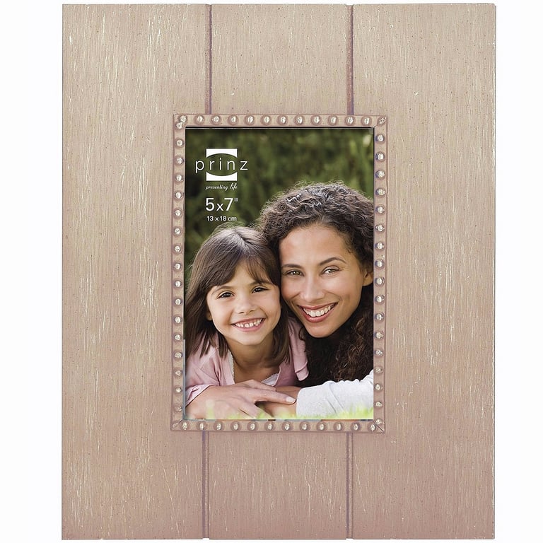 Product Details Prinz® frames & albums PARSON PLANK Natural Stain Wood 5x7 Frame w/Antique Silver Bead Border by Prinz® — PARSON PLANK is a quality wood frame with hand distressed finish. Antique Natural stain color Beaded inner border accent Two-way easel and wall hangers Glare resistant glass lens Displays a 5"x7" print or photo Crafted by Prinz®. PARSON PLANK Natural Stain Wood 5x7 Frame w/Antique Silver Bead Border by Prinz® Model #086981803410 List $22.00 You pay $13.90 In stock Ships next business day [?] Your Price Match is Active Your request for a price of $0.00 for a minimum quantity of has been accepted. You have [time] left to purchase this item for $0.00 instead of $13.90 each. Find a Lower Price? We BEAT All Authorized Retailers [?] FEATURESDisplays:5"x7"Material:Wood (full grain)Finish:Natural, SilverOccasion:Business & office, Friendship, Home decoratingStyle:Distressed - Weathered, Rustic/Lodge, Traditional, GlamOrientation:BothBrand:Prinz® frames & albumsDisplay Type:Desktop or Wall This item ships in its own box SHARE THIS ITEM Share on Facebook