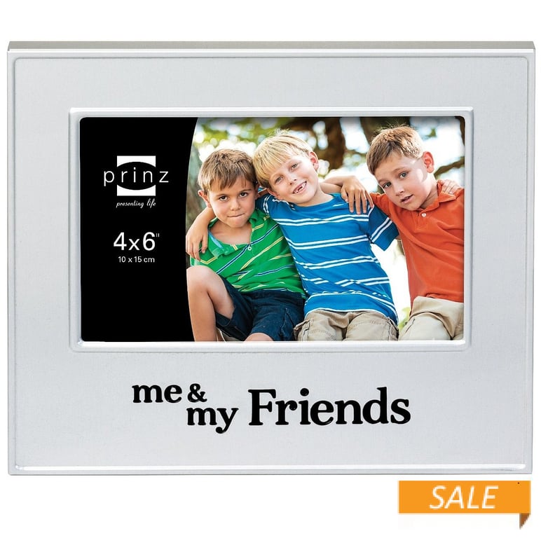 Product Details Prinz® frames & albums ME & MY FRIENDS Brushed Silver 6x4 frame by Prinz® — me & my Friends Add a great photo and you have a gift that brings smiles! Heavy metallic crafted, ridged edging. Beautifully personalized. Holds a 6"x4" photo. Glass lens. Easel back for tabletop display.From the Prinz® series "FAMILY TIES". ME & MY FRIENDS Brushed Silver 6x4 frame by Prinz® Model #086981780957 List $14.00 You pay $6.90 In stock Can be shipped today [?] Your Price Match is Active Your request for a price of $0.00 for a minimum quantity of has been accepted. You have [time] left to purchase this item for $0.00 instead of $6.90 each. Find a Lower Price? We BEAT All Authorized Retailers [?] FEATURESDisplays:4"x6"Material:SilverplateFinish:SilverOccasion:Birthday, Celebrating Travels, Hanukkah, Christmas, Friendship, Sweet 16Style:Child`s play, Contemporary, Words & whimsy, Sentiments | ready madeOrientation:Horizontal OnlyBrand:Prinz® frames & albumsDisplay Type:Desktop or Wall Approx. Overall Dimensions:7 3/8"x5 3/8"x13/16" This item ships in its own box SHARE THIS ITEM Share on Facebook