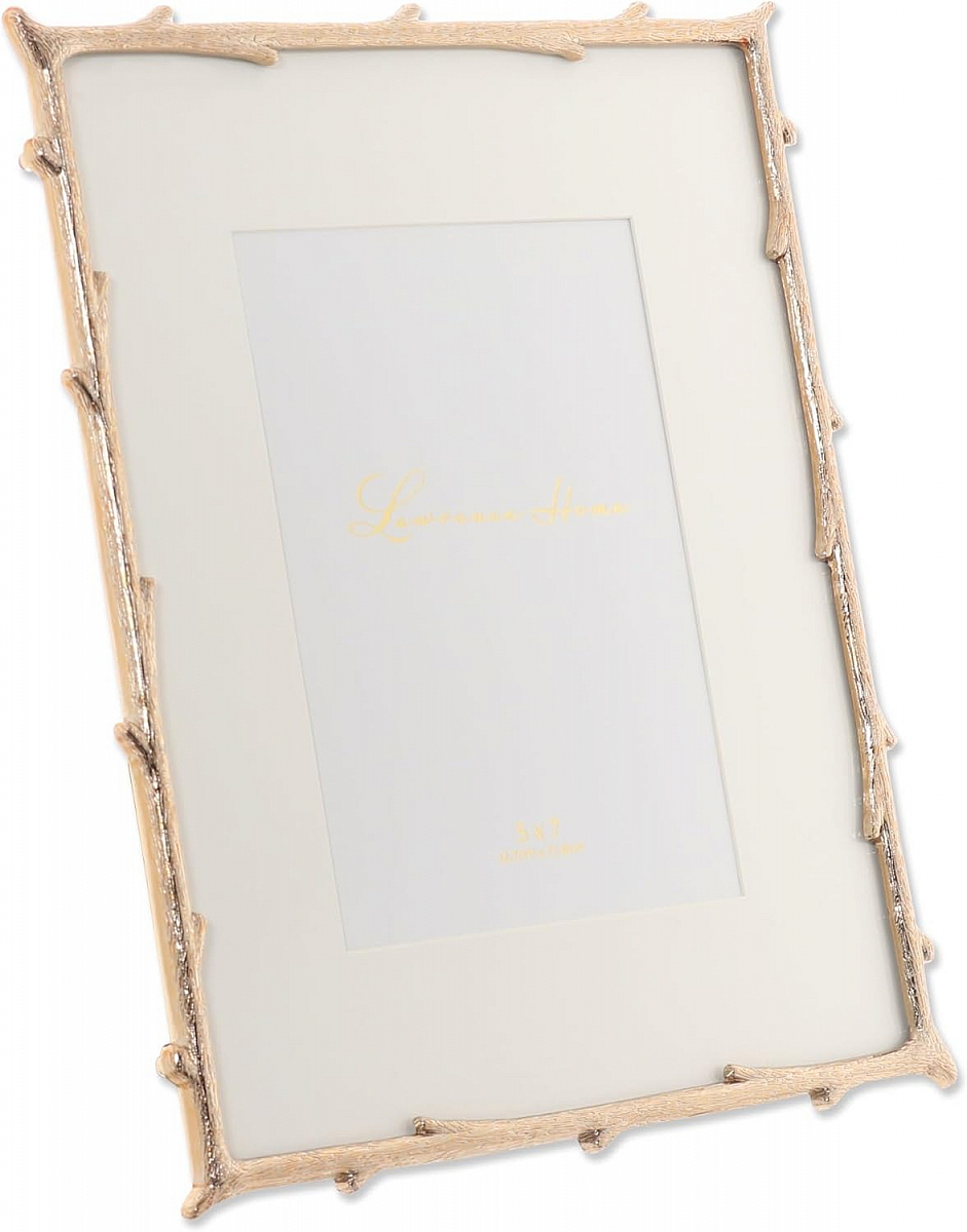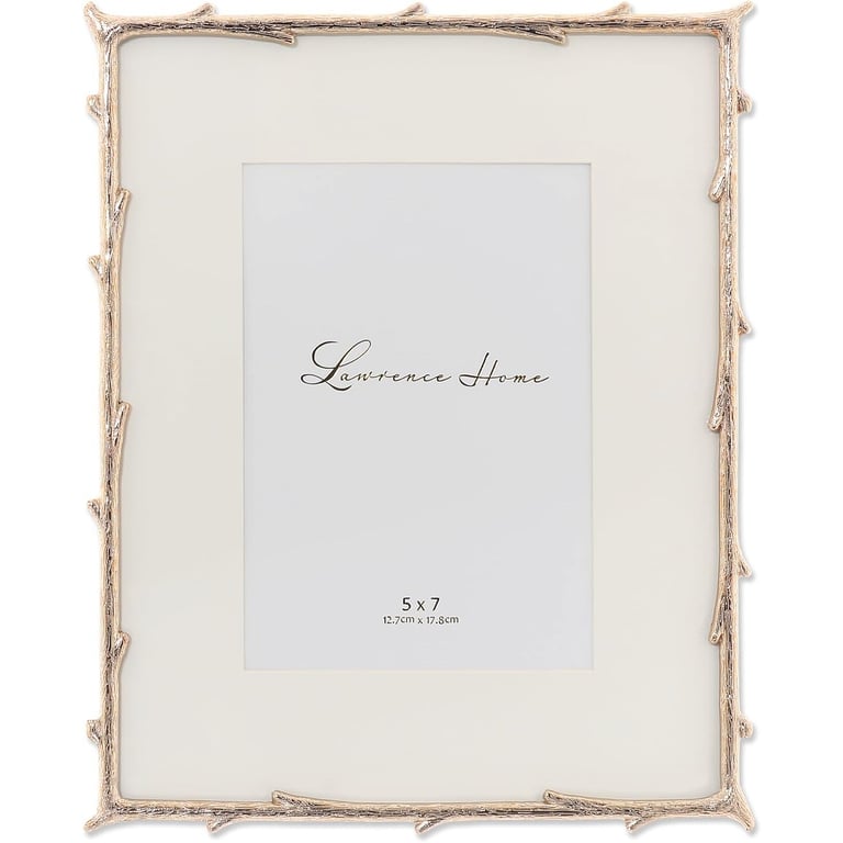 Main view Product Details Lawrence Frames® Gold Metal Natural Branch Motif 8x10/5x7 Matted Frame — Decorative gold branches are the unique design of this picture frame. Polished brass plated metal frame has a rich and lustrous gold finish. High quality black velvet backing with easel for vertical or horizontal tabletop display, and comes with hangers for vertical or horizontal wall mounting. Heavy weight cast metal picture frame. Glass lens. Individually boxed. Dual easel back for portrait or landscape tabletop display. Wall mounts for easy hanging. By Lawrence Frames, fine frames for generations. Gold Metal Natural Branch Motif 8x10/5x7 Matted Frame Model #751148093514 List $50.00 You pay $39.95 This item is currently out of stock and we do not have an expected date at the present time. click here to be automatically notified when it comes back in stock or email merchandising@sendaframe.com for availability information. You can place this item in your shopping cart. It will be added to the 'saved for later' section. Your Price Match is Active Your request for a price of $0.00 for a minimum quantity of has been accepted. You have [time] left to purchase this item for $0.00 instead of $39.95 each. Find a Lower Price? We BEAT All Authorized Retailers [?] FEATURESDisplays:5"x7"Material:Gold plateFinish:GoldOccasion:Anniversary, Birthday, Business & office, Corporate gifts, Engagement, Friendship, Good luck, Home decorating, Weekend Host Gifts, Housewarming, Mother`s Day, Retirement, Thank-Motivate-Reward, WeddingStyle:Classic, TraditionalOrientation:BothBrand:Lawrence Frames®Display Type:Desktop or Wall Approx. Overall Dimensions:5 5/8"x7 5/8"x5/8" This item ships in its own box SHARE THIS ITEM Share on Facebook