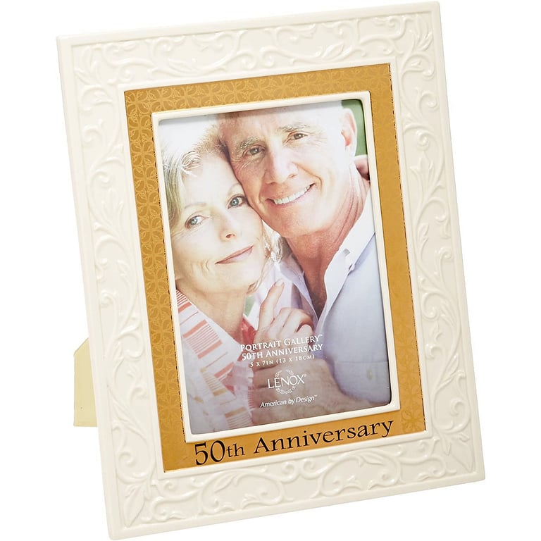 Main view Product Details Lenox® The Lenox® 50th ANNIVERSARY 5x7 Frame — The Lenox 50th Anniversary frame celebrates 50 years of marriage. Sculptured with a swirling openwork design with 24kt gold inner accent, this ivory color china frame speaks of timeless love and elegance, while the inscription, "50th Anniversary" appears in raised script to mark this momentous milestone. From the Lenox® bone china photo frame collection, available in its entirety at SendAFrame for your shopping pleasure. To view the complete collection, visit: the Lenox® Collection. The Lenox® 50th ANNIVERSARY 5x7 Frame Model #882864351739 List $70.00 You pay $59.95 In stock Ships next business day [?] Your Price Match is Active Your request for a price of $0.00 for a minimum quantity of has been accepted. You have [time] left to purchase this item for $0.00 instead of $59.95 each. Find a Lower Price? We BEAT All Authorized Retailers [?] FEATURESDisplays:5"x7"Material:PorcelainOccasion:Anniversary, RomanticStyle:Contemporary, Romantic, Traditional, Words & whimsyOrientation:Vertical OnlyBrand:Lenox®Display Type:Tabletop (or wall w/optional hanger - available separately) This item ships in its own box SHARE THIS ITEM Share on Facebook