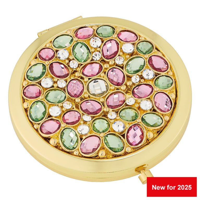 Main view Product Details Olivia Riegel PALM CARAVELLE Compact GOLD/Multi-Color Gemstone PURSE MIRROR by Olivia Riegel® — Inspired by the style and glamour of Palm Beach regency. Palm Caravelle is a gold finished stainless steel mirrored compact, with gold finished pewter face, encrusted with hand-set pink, green, and clear European crystals. Opens up to reveal double-sided mirror, with one side at 1x magnification and one side at 2x magnification. Engravable back. Tarnish resistant. Signature luxury gift box included. An original design from the Olivia Riegel® collection. PALM CARAVELLE Compact GOLD/Multi-Color Gemstone PURSE MIRROR by Olivia Riegel® OLIVIA RIEGEL® WINTER Savings- Buy More / Save More * Add this item to your cart for the full details of this promotion. Conditions may apply. Model #850066618059 $70.00 This item IS in stock and can be expected to ship 01/20/2026 Your Price Match is Active Your request for a price of $0.00 for a minimum quantity of has been accepted. You have [time] left to purchase this item for $0.00 instead of $70.00 each. Find a Lower Price? We BEAT All Authorized Retailers [?] FEATURESMaterial:Jewels/crystalFinish:Gold, Multi-ColorOccasion:Anniversary, Birthday, Friendship, Housewarming, Mother`s Day, Romantic, Valentine`s Day, WeddingStyle:Ornate, Romantic, TraditionalBrand:Olivia RiegelDisplay Type:not applicable n/a Approx. Overall Dimensions:3 1/4"x1/4"x3 1/4" This item ships in its own box SHARE THIS ITEM Share on Facebook