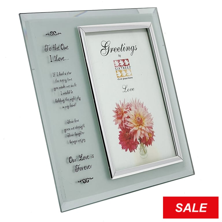 Main view Product Details SIXTREES® TO THE ONE I LOVE .... greeting glass keepsake 4x6 frame — Celebrate your love with this special glass greeting keepsake frame. To the One I Love ... If I had a star for every time you made me smile I would be holding the night sky in my hand! Your love gives me strength Your laughter brings me joy Our Love is Forever Bevelled to create a very attractive desk piece. Nice hardboard backing. Glare resistant glass lens.Crafted by Sixtrees®. TO THE ONE I LOVE .... greeting glass keepsake 4x6 frame Model #783729149235 List $16.50 You pay $7.90 In stock Ships next business day [?] Your Price Match is Active Your request for a price of $0.00 for a minimum quantity of has been accepted. You have [time] left to purchase this item for $0.00 instead of $7.90 each. Find a Lower Price? We BEAT All Authorized Retailers [?] FEATURESDisplays:4"x6"Material:GlassFinish:ClearOccasion:Anniversary, Engagement, Inspirational, Mother`s Day, Romantic, Wedding, Valentine`s DayStyle:Classic, Contemporary, Romantic, Words & whimsy, Sentiments | ready madeOrientation:BothBrand:SIXTREES®Display Type:Desktop Only This item ships in its own box SHARE THIS ITEM Share on Facebook