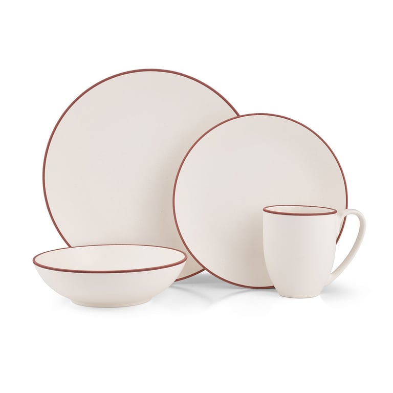 Included in the Taos 4-Piece Place Setting is a dinner plate, accent salad plate, soup/cereal bowl, and mug.