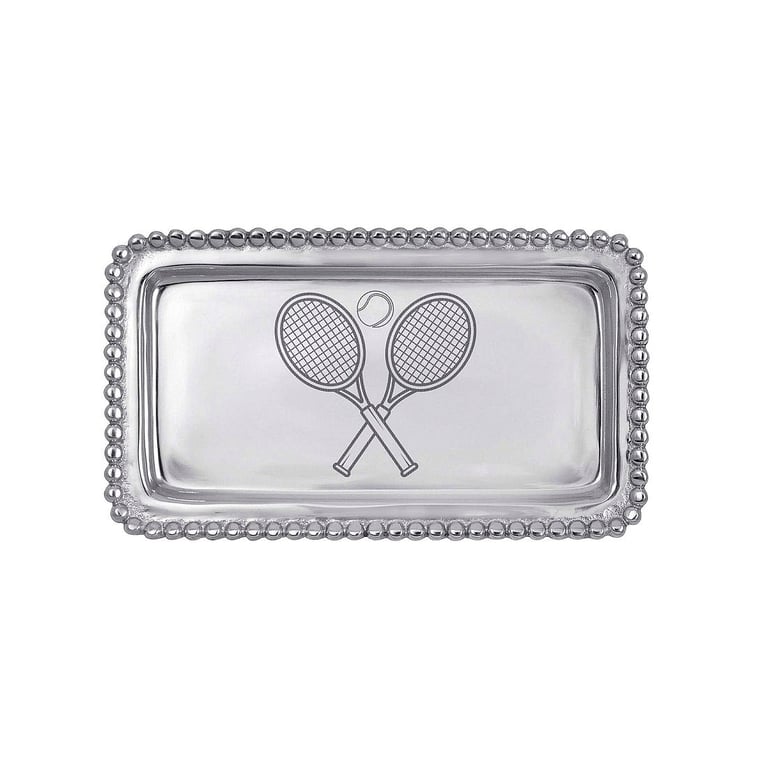 Main view Product Details Mariposa® TENNIS RACQUETS BEADED STATEMENT 7in TRAY by Mariposa® — Gift the TENNIS RACQUETS Beaded Statement Tray to your favorite tennis player. Engraved withtwo crossed tennis racquets and ball. Handcrafted from 100% recycled, buffed-until-brilliant aluminum. Beautifully boxed in a Mariposa Gift Box Shop the entire collection: Mariposa® Design Collection Important Note: Mariposa items are hand engraved. Your piece may differ slightly from the photo. TENNIS RACQUETS BEADED STATEMENT 7in TRAY by Mariposa® Model #808813192079 List $42.00 You pay $38.95 In stock Can be shipped today [?] Your Price Match is Active Your request for a price of $0.00 for a minimum quantity of has been accepted. You have [time] left to purchase this item for $0.00 instead of $38.95 each. Find a Lower Price? We BEAT All Authorized Retailers [?] FEATURESMaterial:AluminumFinish:SilverOccasion:Birthday, Congratulations, Corporate gifts, Group Events + Parties, Friendship, Good luck, Housewarming, Inspirational, Retirement, Thank-Motivate-RewardStyle:Contemporary, Santa Fe, Shabby Chic, Sports & leisure, Words & whimsy, Eco-Friendly-Recycled, Modern (contemporary) wip, Sentiments | ready made, GlamBrand:Mariposa®Display Type:not applicable n/a Approx. Overall Dimensions:6 3/4"x3 3/4"x1/2" This item ships in its own box SHARE THIS ITEM Share on Facebook