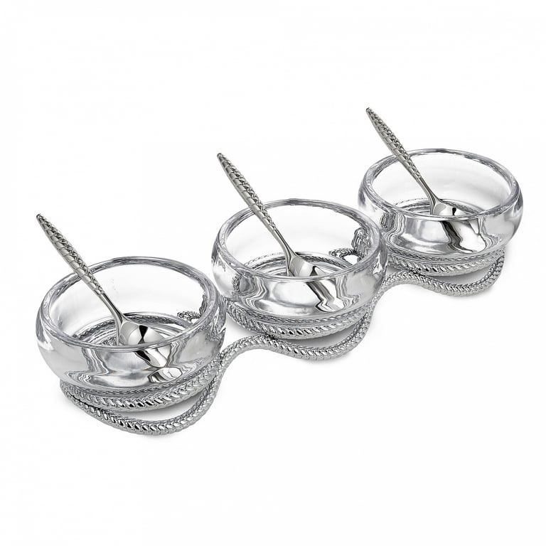 Main view Signature Gift Box (sample) Product Details Nambe The Original BRAID TRIPLE CONDIMENT SET crafted by Nambe® — Three glass bowls rest on an artful coil of braided chrome to create the Braid Triple Condiment Set. Great for presenting a trio of dipping sauces, nuts, dried fruits and more, the set includes three serving spoons with the matching braid detail. Made of Glass, Stainless Steel and Chrome Plate 13” L x 4” W x 3” H Spoon: 5” L, ea. Bowls and Spoons: Dishwasher safe, Base: Hand wash; dry immediately Designed by Sean O'Hara Ships in signature Nambe® gift box Nambe® pieces are everyday art that are designed to be used - Enjoy! To view all the Nambé® styles, click: Nambé® Design Collection. The Original BRAID TRIPLE CONDIMENT SET crafted by Nambe® Model #672275311756 $170.00 This item IS in stock and can be expected to ship 02/11/2026 Your Price Match is Active Your request for a price of $0.00 for a minimum quantity of has been accepted. You have [time] left to purchase this item for $0.00 instead of $170.00 each. Find a Lower Price? We BEAT All Authorized Retailers [?] FEATURESMaterial:GlassFinish:Clear, SilverOccasion:Birthday, Congratulations, Corporate gifts, Employee honors, Group Events + Parties, Friendship, Good luck, Home decorating, Housewarming, Mother`s Day, Retirement, Thank-Motivate-Reward, Wedding, Weekend Host GiftsStyle:Contemporary, Santa Fe, Shabby Chic, Eco-Friendly-Recycled, Modern (contemporary) wip, PreppyBrand:NambeDisplay Type:not applicable n/a Approx. Overall Dimensions:13"x3"x4" This item ships in its own box SHARE THIS ITEM Share on Facebook
