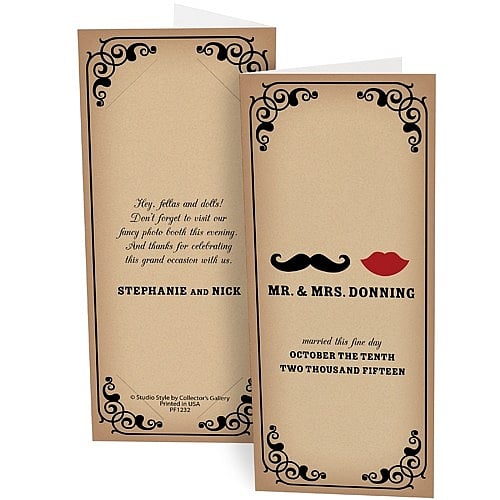 Back to results Scroll Items 7883 of 11263 Product Details Collectors Gallery MUSTACHE Personalized Photo Strip holders for 2x6 Photobooth Prints — Photo booths are popular at weddings, sweet 16 parties, quinceaneras, bar/bat mitzvahs, graduations, anniversaries, family reunions, holiday parties, festivals, and corporate events. Give guests something to take their photo strips home in with a personalized folder. Choose from any of our customizable designs, or create a folder unique for your event. All designs are printed on smooth, lightweight 12 pt. paper stock and hold a classic 2" x 6" picture strip. Whether it's a party favor or a marketing piece for your company, photo booth folders make great event souvenirs. An inexpensive party favor Overall size measures 3" x 7" (when closed) Holds a 2" x 6" photo (for photobooth strips) Lightweight smooth finish paper Inside corner die-cuts hold picture in place Shipped flat, not folded FREE personalization included in the price Envelopes are not available Sold in increments of 10; minimum 100 folders. MUSTACHE Personalized Photo Strip holders for 2x6 Photobooth Prints Model #021352012329 $9.90 ( set of 10 / $0.99 ea ) This item can be expected to ship by 12/05/2025. Order now by clicking ADD TO CART (below); you are only charged when we actually ship. Or, Click here to be automatically notified when it comes back in stock. Your Price Match is Active Your request for a price of $0.00 for a minimum quantity of has been accepted. You have [time] left to purchase this item for $0.00 instead of $0.99 each. Find a Lower Price? We BEAT All Authorized Retailers [?] FEATURESDisplays:2"x6"Material:Card-stockFinish:Black, Bronze, Brown, Multi-Color, WhiteOccasion:Bar & Bat Mitzvah, Group Events + Parties, WeddingStyle:Bold Colors, Contemporary, Pop Culture, Words & whimsyDisplay Type:not applicable n/a Approx. Overall Dimensions:3"x7" SHARE THIS ITEM Share on Facebook