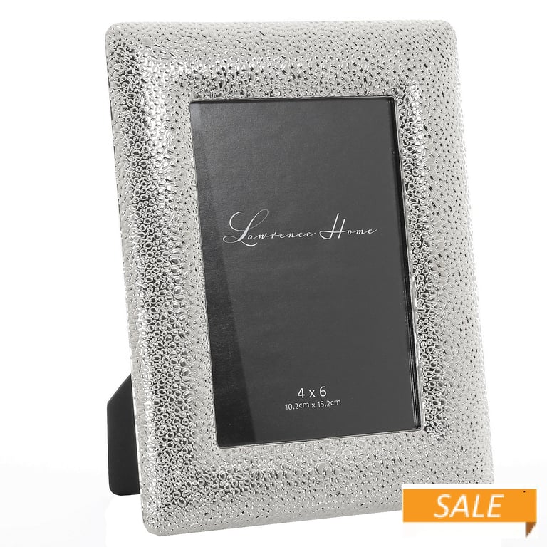Main view Product Details Lawrence Frames® SILVER PEBBLE 4x6 Frame — Decorative silver metal picture frame with elegant embossed pebble pattern. This polished silver plated metal frame has a rich and lustrous finish. High quality black velvet backing with easel for vertical or horizontal tabletop display. This is a polished metal picture frame of excellent workmanship and comes with glass to protect your print. Individually boxed. Crafted by Lawrence®. SILVER PEBBLE 4x6 Frame Model #48082730 List $24.50 You pay $10.90 In stock Ships next business day [?] Your Price Match is Active Your request for a price of $0.00 for a minimum quantity of has been accepted. You have [time] left to purchase this item for $0.00 instead of $10.90 each. Find a Lower Price? We BEAT All Authorized Retailers [?] FEATURESDisplays:4"x6"Material:SilverplateFinish:SilverOccasion:Business & office, Employee honors, Good luck, Home decorating, Housewarming, Thank-Motivate-Reward, Celebrating Travels, BirthdayStyle:Classic, ContemporaryOrientation:BothBrand:Lawrence Frames®Display Type:Tabletop (or wall w/optional hanger - available separately) This item ships in its own box SHARE THIS ITEM Share on Facebook